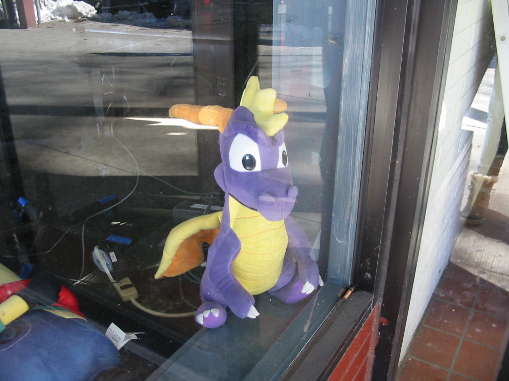 I've been meaning to get these off my camera for so long now. back in January, we visited a local geek con, and I didn't notice the "no photos" sign long enough to take some (not amazing quality) photos. There were people selling retro games, which is always great to peek through, but nothing I was willing to pay probably eBay prices for, and the controller selection (which I was actually after a spare DualShock) was lacking and overpriced. One of the booths was like a hybrid geek art-jams and jellies thing shared by a daughter and her father, and that was pretty fun at least. Elsewhere on Main Street, we saw a Spyro peeking at us through one of the shop windows. What a good dogie.